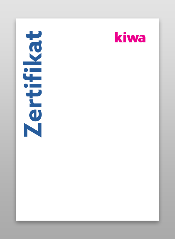 The certificate will feature the Kiwa logo applied in glossy foil stamping. In the preview, the designated area is indicated by a red logo. Please note that this red logo will not appear on the final certificate; it is shown for reference purposes only to indicate the foil-stamped area.